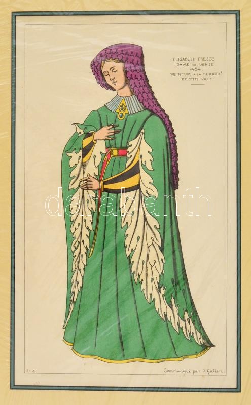 cca 1860-1870 Raphael Jacquemin (1821-1881): Elisabeth Fresco Dame de Venice,(in: Supplément a L'Iconographie général et méthodique du costume du IV au XIX siecle. (315-1815)), színezett litográfia, papír, paszpartuban, műanyag védőfóliában, 39x22 cm./ cca 1860-1870 Raphael Jacquemin (1821-1881): Elisabeth Fresco Dame de Venice,(in: Supplément a L'Iconographie général et méthodique du costume du IV au XIX siecle. (315-1815)), colored litography, paper, in paspartu, 39x22 cm.