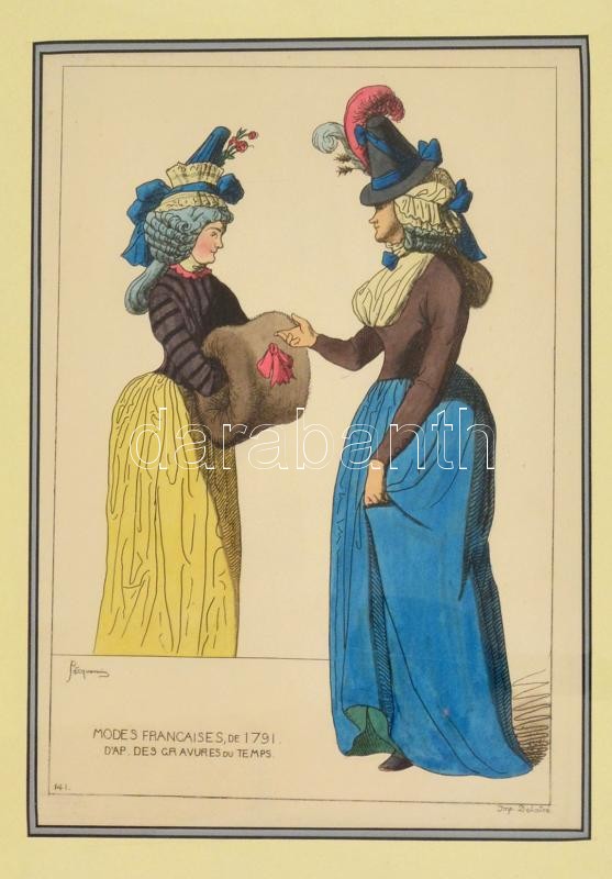 cca 1860-1870 Raphael Jacquemin (1821-1881): Modes Francaises,(in: Iconographie général et méthodique du costume du IV au XIX siecle. (315-1815)), színezett litográfia, papír, paszpartuban, műanyag védőfóliában, 31x21 cm./ cca 1869 Raphael Jacquemin (1821-1881): Modes Francaises,(in: Iconographie général et méthodique du costume du IV au XIX siecle. (315-1815)), colored litography, paper, in paspartu, 31x21 cm.