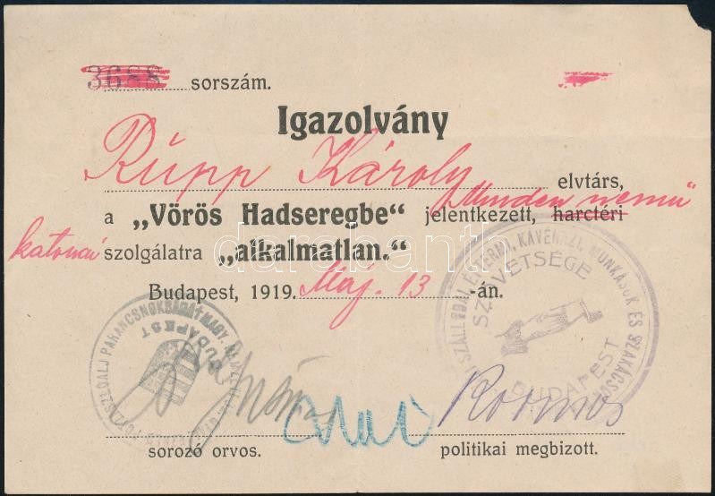 1919 Igazolvány Vörös Hadseregbe jelentkezett alkalmatlanságáról, pecs... https://www.darabanth.com/hu/320-Gyorsarveres/320.0/Festmeny-mutargy-papirregiseg-egyeb/Militaria~500027/1919-Igazolvany-Voros-Hadseregbe-jelentkezett-alkalmatlansagarol-pecsettel-alairassal-1~II1767778