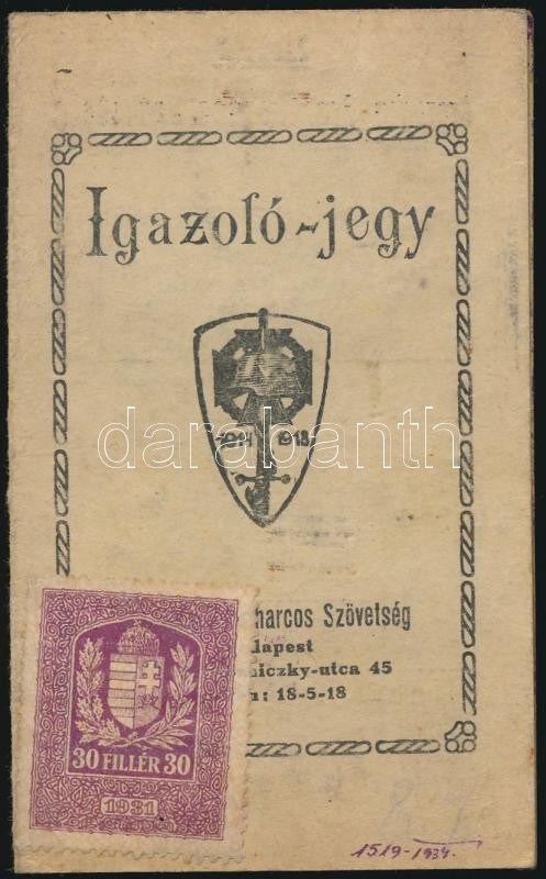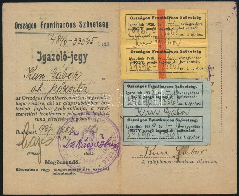 Leírás: 1933 Országos Frontharcos Szövetség igazoló jegy, befizetési szelvényekkel, aláírva, pecsételve