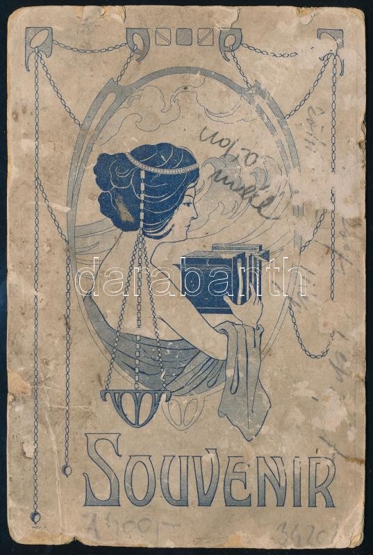 Leírás: cca 1900 Katona díszes portréja, rajta Ferenc József képével, címerrel, sérült, 16x10,5 cm