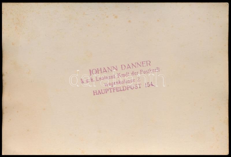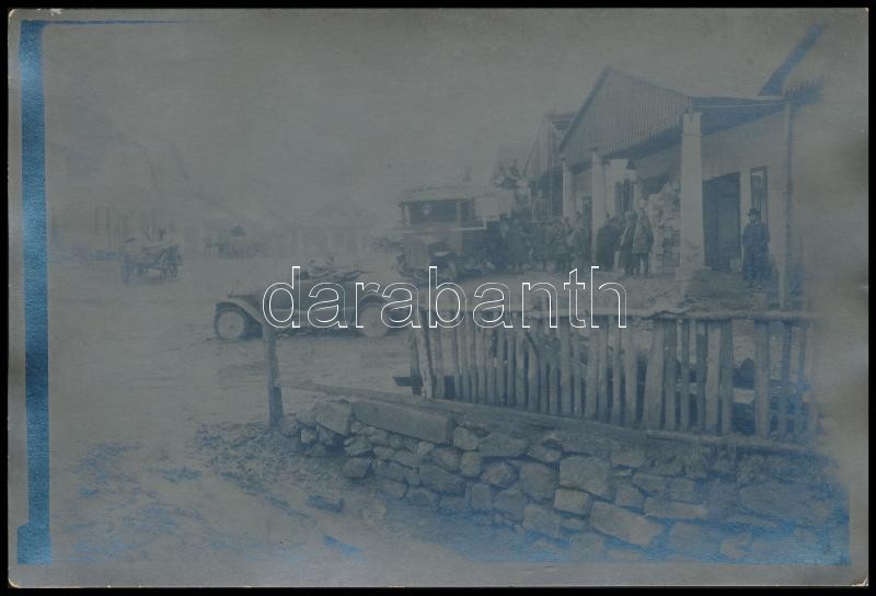 cca 1914-1918 Katonák pakolnak le egy ház előtt teherautóról, Johann Danner k.u.k. Leutnant Kmdt. der Psotkraftwagenkolonne 2., hátoldalon pecséttel jelzett fotó, 15x10 cm