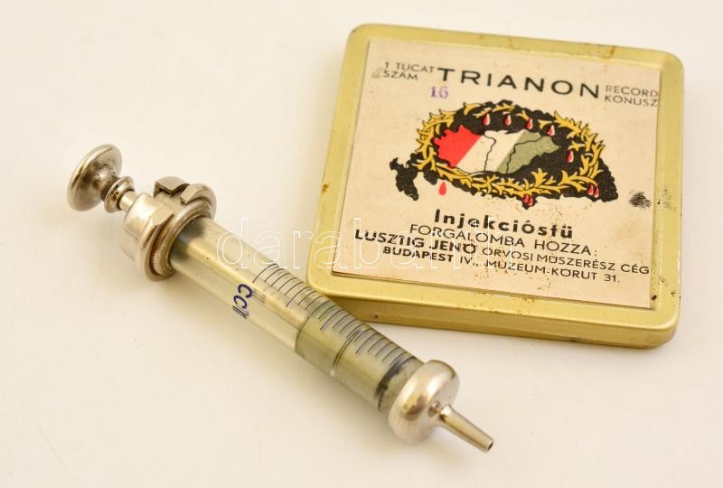 cca 1930 Trianon irredenta címkéjű fém dobozos injekciós tű és tű kész... https://www.darabanth.com/hu/320-Gyorsarveres/320.0/Festmeny-mutargy-papirregiseg-egyeb/Mutargyak-antikvitas~500004/cca-1930-Trianon-irredenta-cimkeju-fem-dobozos-injekcios-tu-es-tu-keszlet~II1768587