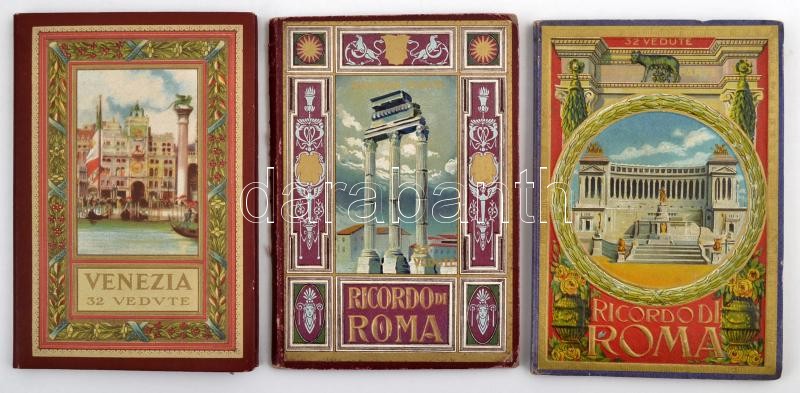Leírás: 3 db régi leporelló: 2 db Róma, 1 db Velence, többnyelvű leírásokkal, egyben színes, kettőben fekete-fehér képekkel, kopott borítókkal.