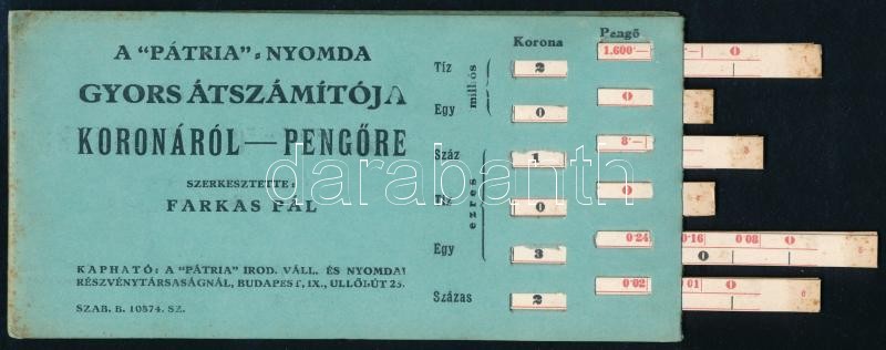 Leírás: cca 1927 A "Pátria" Nyomda gyors átszámítója koronáról pengőre, 8x15,5 cm