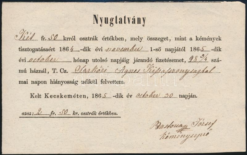 Leírás: 1865 Kecskeméti kéményseprő díjnyugta