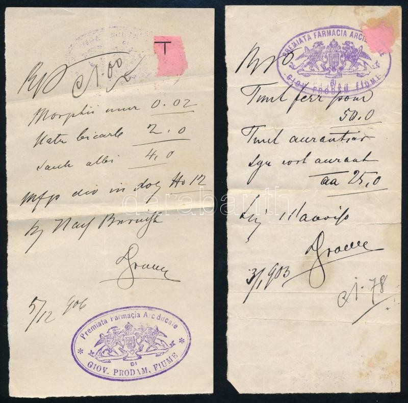 Leírás: 1903-1906 3 db orvosi recept fiumei bélyegzőkkel