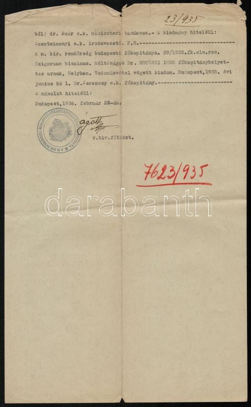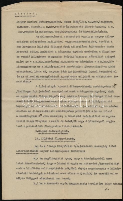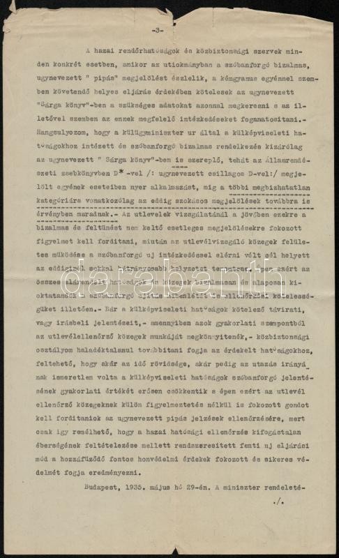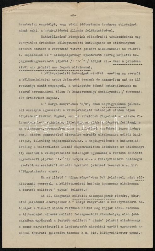 1936 A m. kir. belügyminiszter bizalmas rendelete a Sárga könyv szerinti kémgyanús egyének esetében figyelembe veendő különleges szempontokról. 4 gépelt oldal