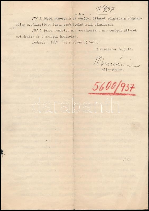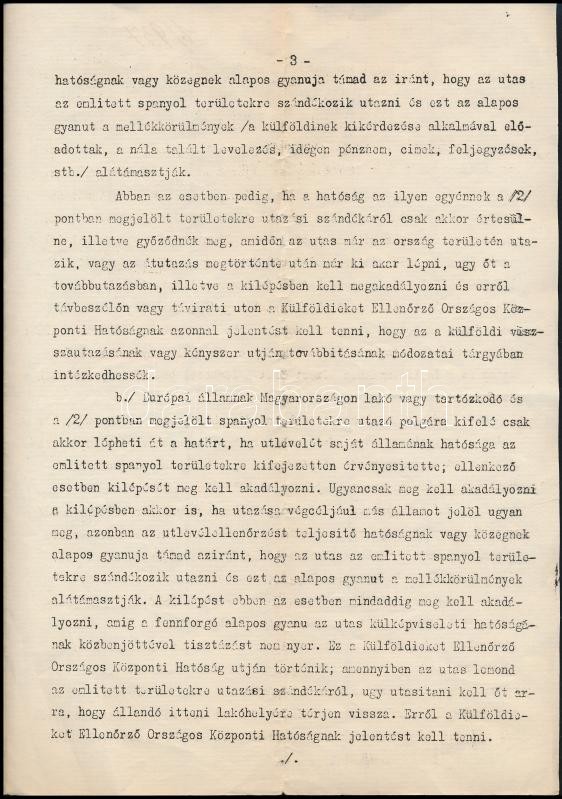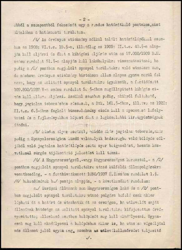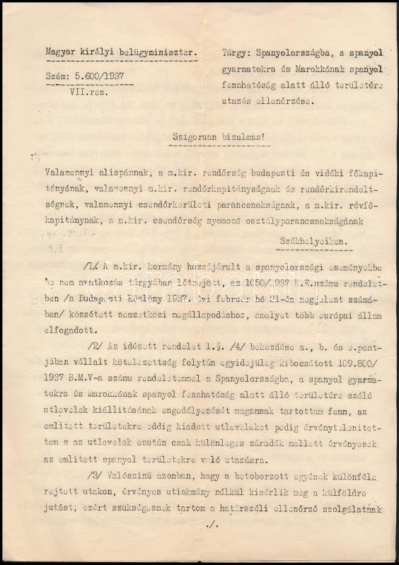 1937 A m. kir. belügyminiszter bizalmas rendelete a spanyol polgárháborúba be nem avatkozásról kötött nemzetközi szerződéssel összefüggésben a magyar rendőrség feladatairól. 4 gépelt oldal