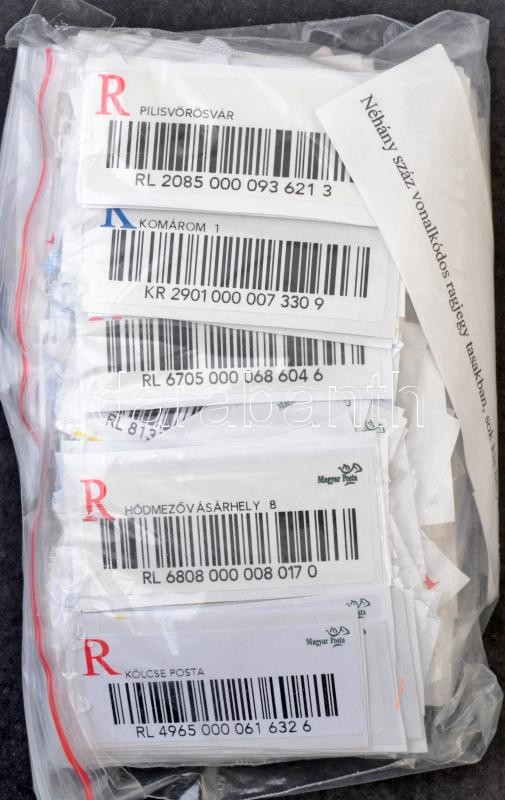 Leírás: Néhány száz vonalkódos ajánlási ragjegy tasakban, sok kis helységgel
