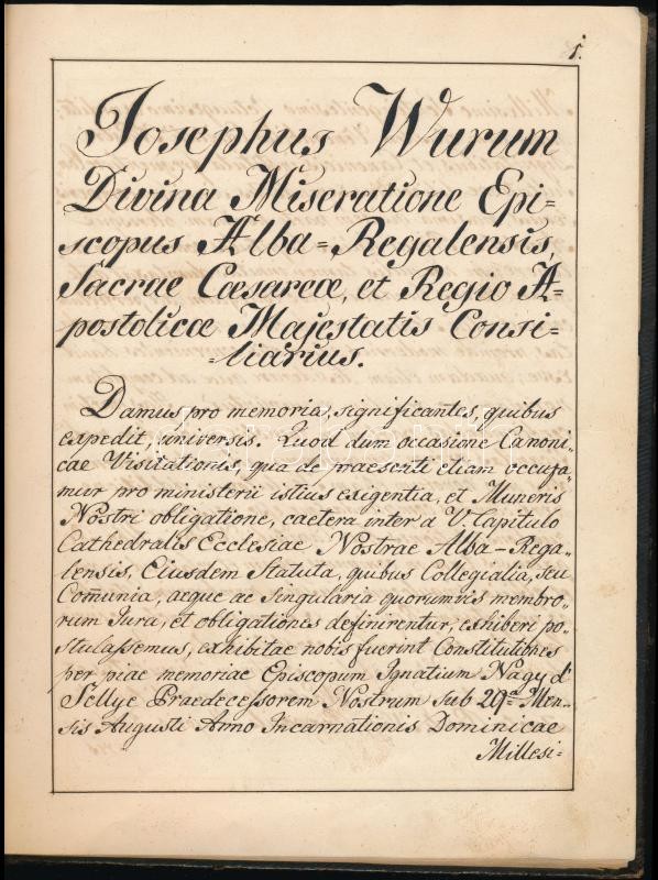 cca 1839 Statuta venerabili capituli Alba Regalensis, a székesfehérvári káptalan statútumai, kézzel írt másolat az egyházlátogatási jegyzőkönyvből, bőrkötésben, 61 p.