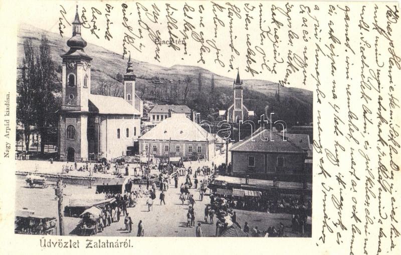 Leírás: 1904 Zalatna, Zlatna; Piac tér, árusok, templomok, üzlet. Nagy Árpád kiadása / market square, vendors, churches, shop (EK)