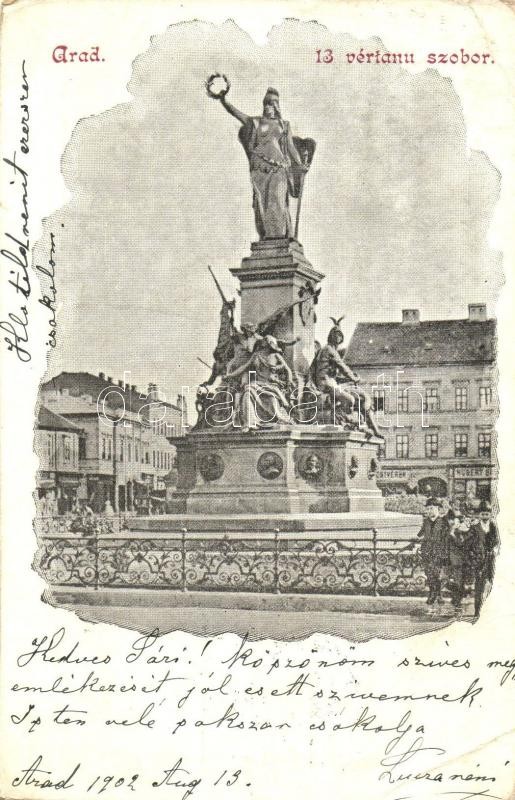Leírás: Arad, 13 vértanú szobor, Hubert üzlete / martyrs' monument, statue, shops (EK)