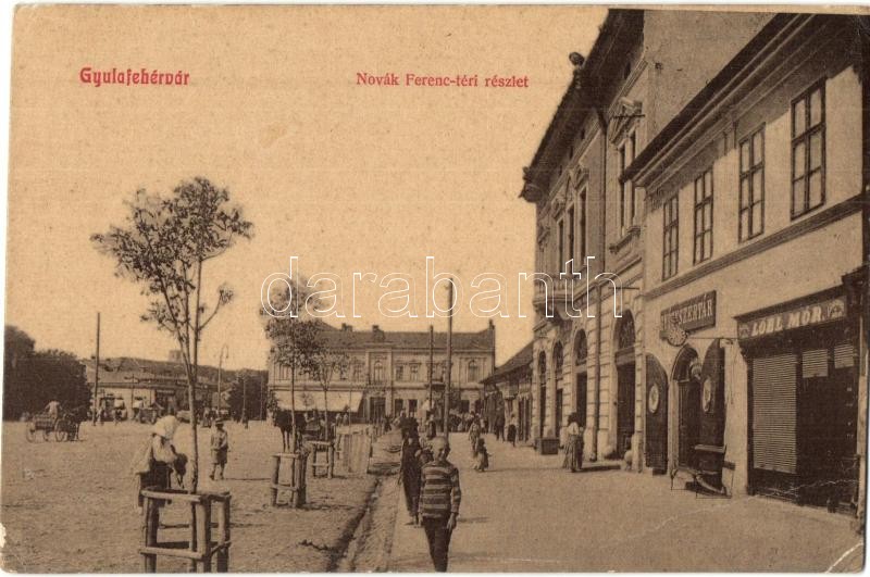 Leírás: Gyulafehérvár, Karlsburg, Alba Iulia; Novák Ferenc tér, Gyógyszertár, Lóbl Mór üzlete. W. L. 3164. / square, pharmacy, shops (EB)