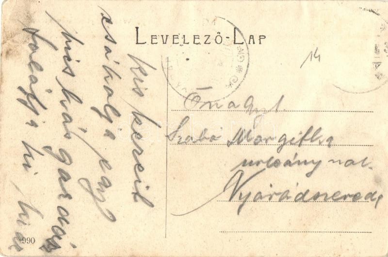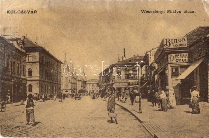Kolozsvár, Cluj; Wesselényi Miklós utca, Hermann Gyula, Szőcs Ferencz, Klein R. és Társa, Legman Samu, Farkas, Janovitz Géza üzlete, Economul bank. 990. / street view, shops, bank (gyűrődés / crease)