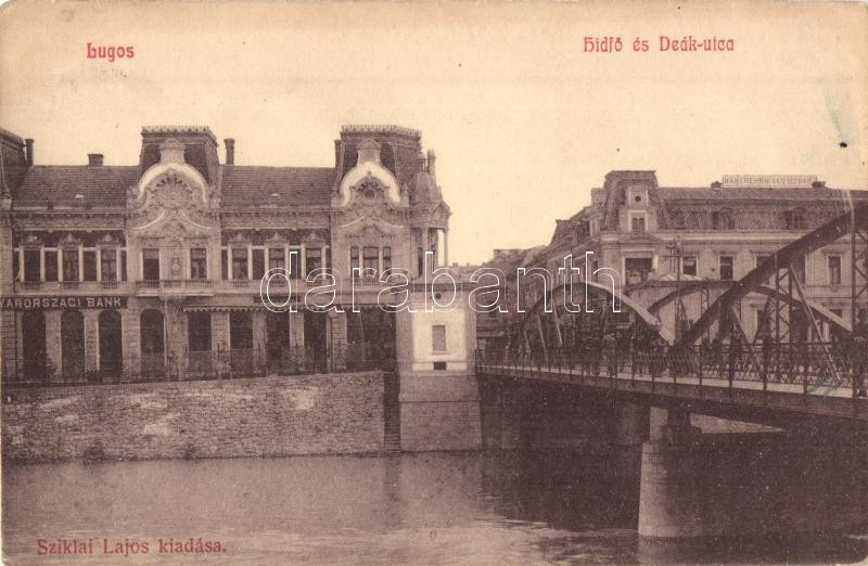Leírás: Lugos, Lugoj; Hídfő és Deák utca, Bank, Corso Kávéház, Haberehrn vas-udvar, üzlet. 351. Sziklai Lajos kiadása / bridge, bank, café, shops (EK)