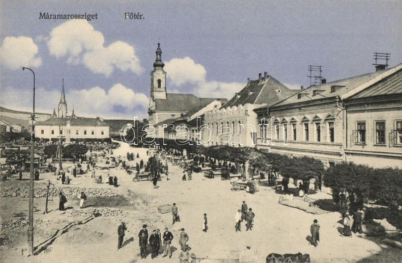 Leírás: Máramarossziget, Sighetu Marmatiei; Fő tér, piac, árusok, templom. Wizner és Dávid kiadása / main square, market, vendors, church