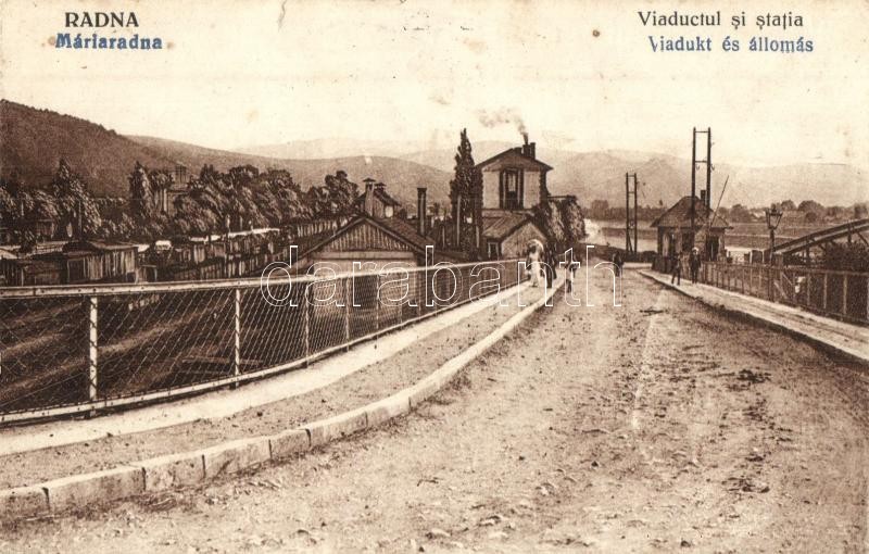 Leírás: Máriaradna, Radna; Viadukt és vasútállomás, gőzmozdony. Hangya Szövetkezet kiadása / viaduct, railway station, locomotive / Viaductul si statia (EK)