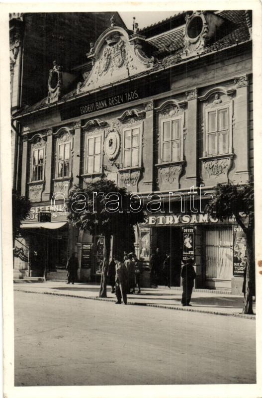 Leírás: Marosvásárhely, Targu Mures; Toldalagi ház (épült 1770-ben), Erdélyi Bank rt., Petry Samu üzlete / Palatul Toldalagi, bank, shops