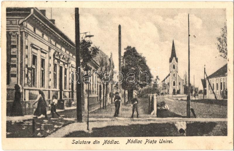 Leírás: Nagylak, Nadlac; Fő tér templommal / Piata Unirei / main square with church