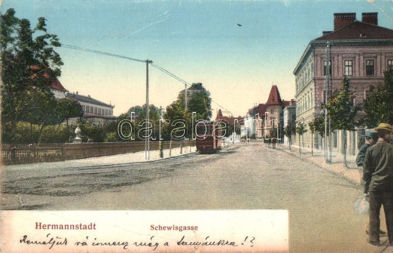 Nagyszeben, Hermannstadt, Sibiu; Schewisgasse. Verlag G. A. Seraphin, Cromophot. v. Jos. Drotleff / Schewis utca, villamos / street view, tram (szakadás / tear)
