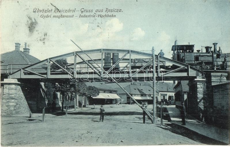 Resicabánya, Resita; Gyári magasvasút, gőzmozdony, iparvasút, híd, Schvarcz József, Roth Berta, Roth Mór üzlete. Weiss Adolf kiadása, Horváth László felvétele / Industrie Hochbahn / industrial railway, locomotive, bridge, shops