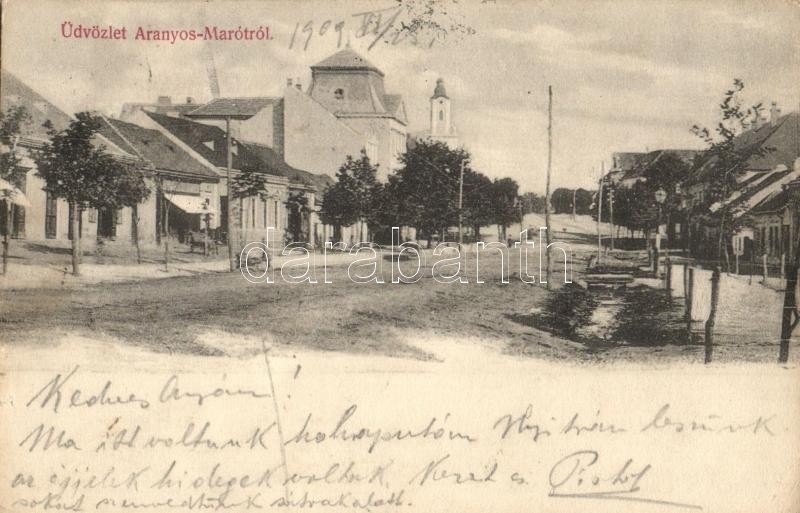 Leírás: Aranyosmarót, Zlaté Moravce; utcakép, üzlet. Steiner Samu kiadása / street view, shop (Rb)