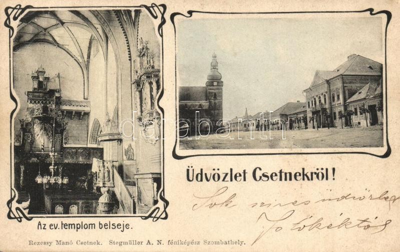 Csetnek, Stítnik; Evangélikus templom, templom belső, Fő utca, üzletek. Rezessy Manó kiadása, Stegmüller A. N. fényképész felvétele / Lutheran church, interior, main street, shops. Art Nouveau (EK)