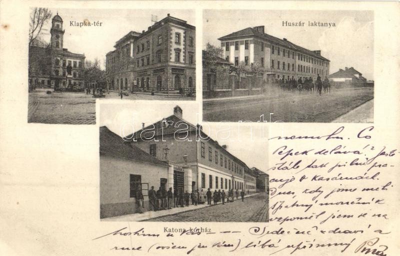 Leírás: Komárom, Komárno; Klapka tér, Klapka György szobor, üzletek, Huszár laktanya, huszárok, Katonai kórház / square, statue, shops, hussar barracks, military hospital
