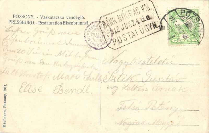 Pozsony, Pressburg, Bratislava; Vaskutacska vendéglő, étterem, fürdő, ... https://www.darabanth.com/hu/320-Gyorsarveres/320.0/Kepeslapok/Felvidek~1500006/Pozsony-Pressburg-Bratislava-Vaskutacska-vendeglo-etterem-furdo-kert-pincerek-Kaufmann~II1772178