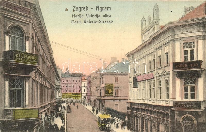 Zágráb, Agram, Zagreb; Marija Valerija ulica / Marie Valerie-Strasse / Mária Valéria utca, lóvasút, bank, üzletek. W. L. Bp. 1608. / street view, horse-drawn tram, bank, shops (Rb)