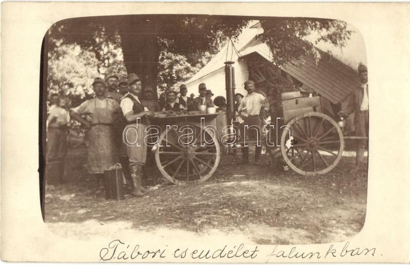 Leírás: 1914 Tábori csendélet a faluban, tábori konyha, katonák főzés közben / WWI K.u.K. military field kitchen, cooking soldiers, photo