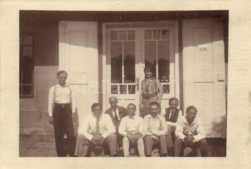 1931 Budapest, M. kir. Légügyi Hivatal irodájának személyzete, hátoldalon nevek / Hungarian aeronautical office staff in Budapest, names on the backside. photo (vágott / cut)