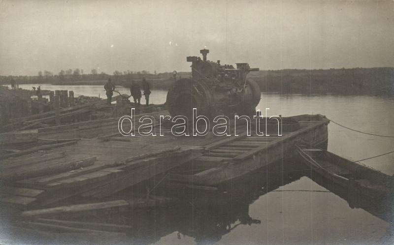 Gőzgép szállításra készen egy tutajon, osztrák-magyar katonák / WWI Austro-Hungarian K.u.K. soldiers with a steam engine ready to transport via raft in Dorohusk. photo (EK)