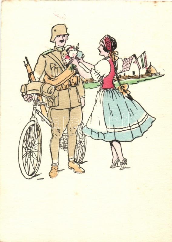 Honvéd katona bevonuláskor honleánnyal és kerékpárral. Kiadja a Defhe Aradi Temesi Bánság / WWII entry of the Hungarian troops, bicycle, compatriot woman, bouquet. military art postcard