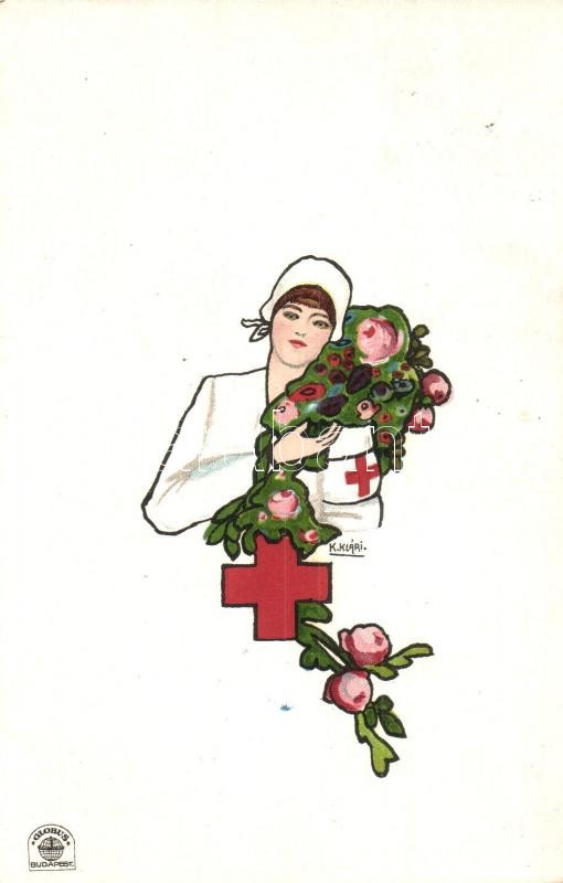 WWI Red Cross nurse charity art postcard. s: K. Klári https://www.darabanth.com/hu/320-Gyorsarveres/320.0/Kepeslapok/Katonai~1500066/WWI-Red-Cross-nurse-charity-art-postcard-s-K-Klari~II1769663