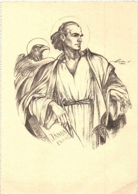 3 db régi Márton L. művészlap, freskó karton az abasári templomhoz: Lukács, János, Máté evangelisták / 3 pre-1945 art postcards, Evangelists, with the signature of Márton L.