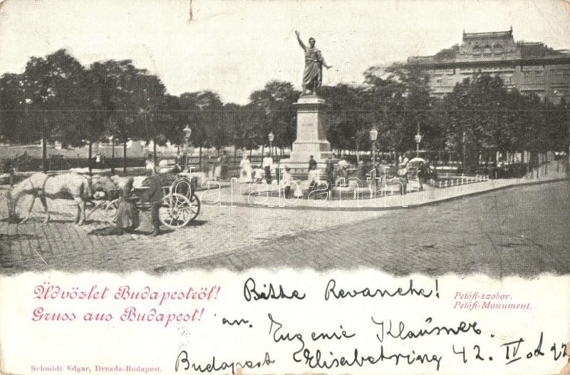 1899 Budapest V. Petőfi szobor, lovaskocsi. Schmidt Edgar kiadása (r) https://www.darabanth.com/hu/320-Gyorsarveres/320.0/Kepeslapok/Magyarorszag~1500004/1899-Budapest-V-Petofi-szobor-lovaskocsi-Schmidt-Edgar-kiadasa-r~II1697257