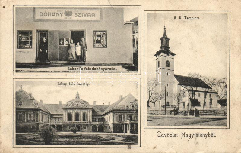 Leírás: Budapest XXII. Nagytétény, Lőwy féle kastély, Római katolikus templom, Babonits féle dohányáruda, kiadja Babonits Ferencz (EK)