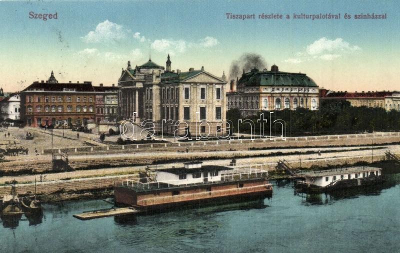 Leírás: Szeged, Tiszapart, Kultúrpalota, színház, úszóházak