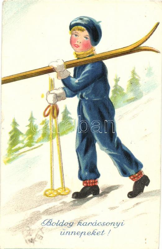 Leírás: Boldog Karácsonyi Ünnepeket! Síelő, téli sport / Christmas greeting card with skier, skiing, winter sport (EK)