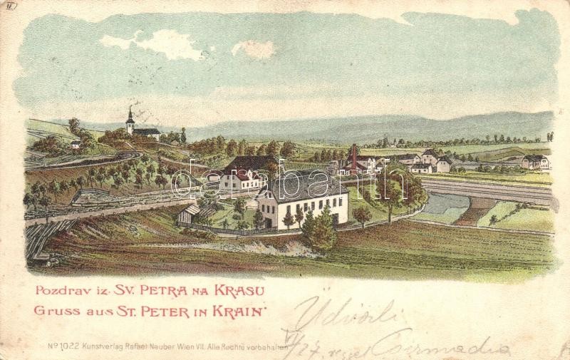 Leírás: Pivka, St. Peter in Krain; general view, church. Kunstverlag Rafael Neuber No. 1022. Art Nouveau litho (Rb)