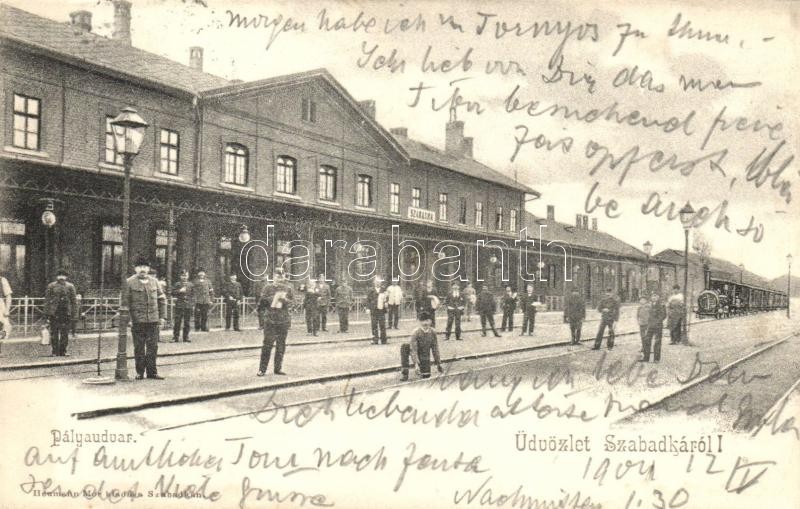 Leírás: Szabadka, Subotica; Vasútállomás, gőzmozdony, vasutasok. Heumann Mór kiadása / railway station, locomotive, railwaymen