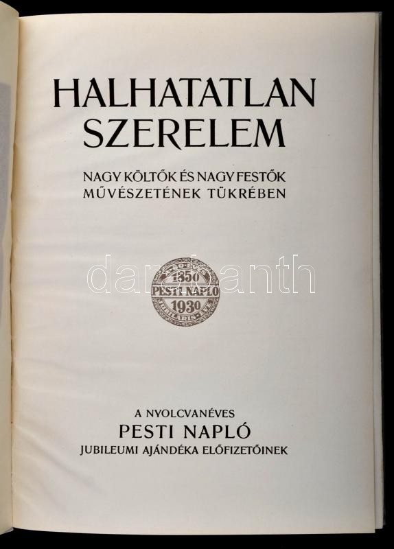 Halhatatlan szerelem. Nagy költők és nagy festők művészetének tükrében. A nyolcvanéves Pesti Napló jubileumi ajándéka előfizetőinek. Bp.,1930, Pesti Napló. Rengeteg képpel illusztrált. Kiadói egészvászon-kötésben, jó állapotban.