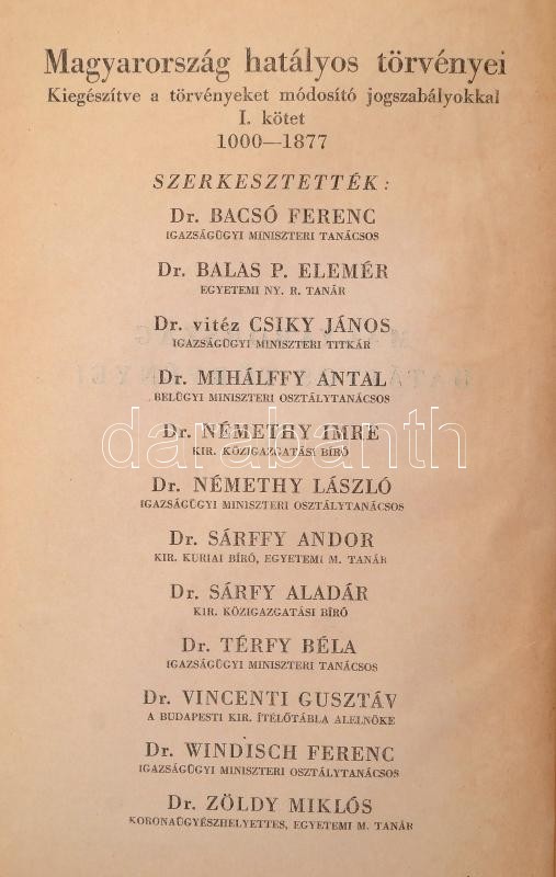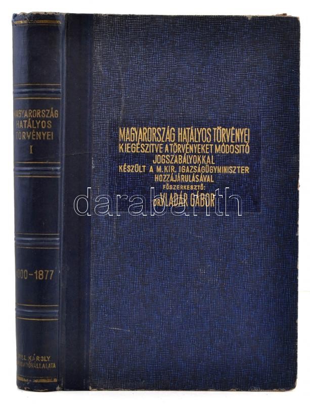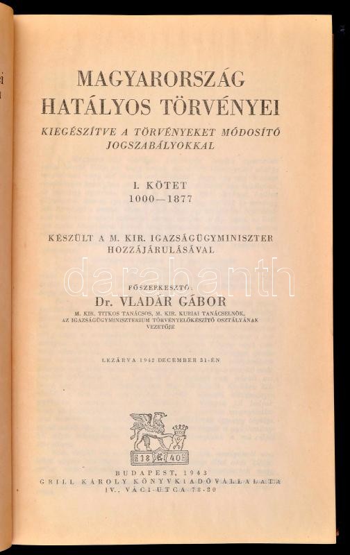 Leírás: Magyarország hatályos törvényei kiegészítve a törvényeket módosító jogszabályokkal. I. kötet 1000-1877. Szerk.: Vladár Gábor: Bp., 1943, Grill Károly. Kiadói aranyozott félvászo-kötés, Corvina-kötés, kissé kopottas borítóval.