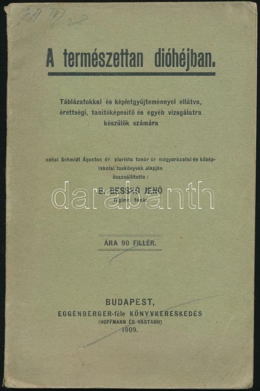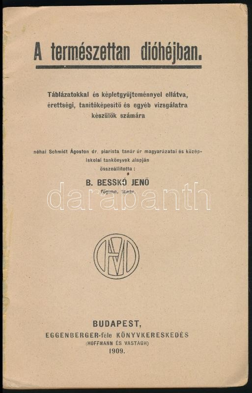 A természettan dióhéjban.Táblázatokkal, és képletgyűjteménnyel ellátva, érettségi, tanítóképesítő és egyéb vizsgálatra készülők számára. Összeállította: B. Besskó Jenő. Bp., 1909, Eggenberger-féle Könyvkereskedés (Hoffmann és Vastagh), 124+1p.+ 3 kihajtható melléklettel. Kiadói papírkötés. Jó állapotban.