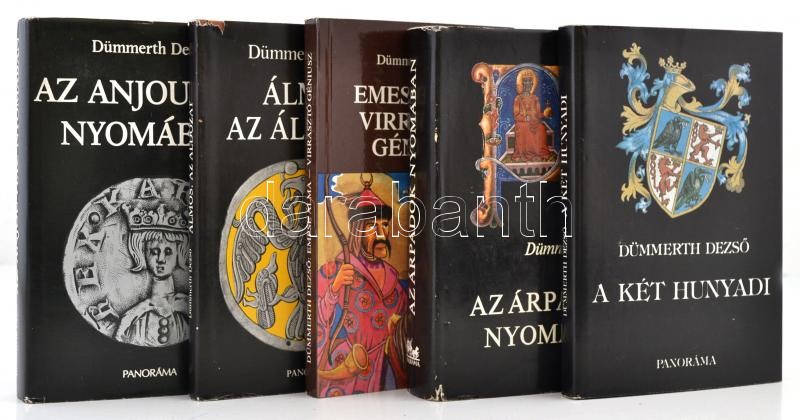 Dümmerth Dezső 5 könyve: A két Hunyadi, Álmos, az áldozat, Az Ajnou-ház nyomában, Az árpádok nyomában. Bp.,1977-1986, Panoráma. Kiadói egészvászon-kötés, kiadói papír védőborítóban. Emese álma - virrasztó géniusz. Bp.,1987, Ifjúsági Lap és Könyvkiadó. Kiadói papírkötés.