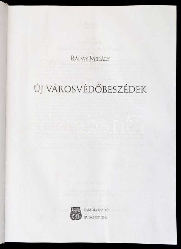 Ráday Mihály: Új városvédőbeszédek. Bp., 2001. Tarsoly kiadó. Fekete-f... https://www.darabanth.com/hu/320-Gyorsarveres/320.0/Konyvek/Konyvek-Utazas-helytortenet~2000001/Raday-Mihaly-Uj-varosvedobeszedek-Bp-2001-Tarsoly-kiado-Fekete-feher-es-szines-kep~II1718810