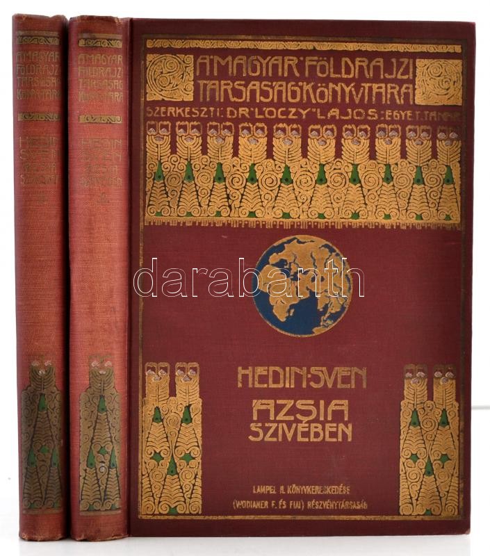 Sven Hedin: Ázsia szívében I-II. kötet. Tízezer kilométernyi úttalan utazás. Fordította: Dr. Thirring Gusztáv. képpel és térképpel. Magyar Földrajzi Társaság Könyvtára. Bp., é. n., Lampel R. (Wodianer F. és Fiai) Rt., 10+214+2+6+270+2 p. Gazdag fekete-fehér fotókkal és egy térképpel illusztrálva. Kiadói dúsan aranyozott egészvászon sorozat, a gerinc fakó, az I. kötetből a térkép hiányzik, alapvetően jó állapotban.