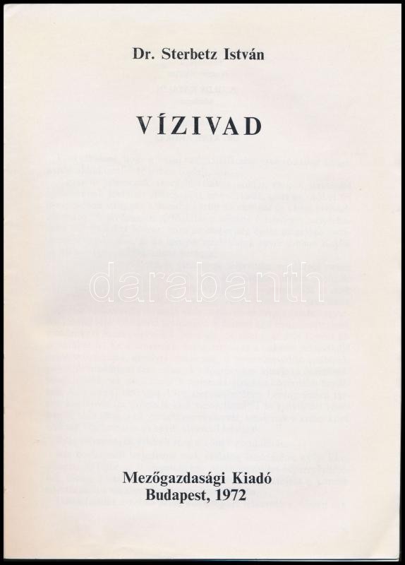 Dr. Sterbetz István: Vízivad. Bp.,1972, Mezőgazdasági Kiadó. Szövegközti fekete-fehér fotókkal, és ábrákkal, és egészoldalas fekete-fehér és színes képekkel, illusztrációkkal illusztrálva. Kiadói papírkötés, kiadói kopott, kissé szakadt papírborítékban.